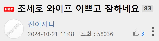 “참하고 이쁘네..” 일반인인 조세호 아내 얼굴 누가 커뮤에 올려 난리난 상황 ㄷㄷ 10월 22, 2024 작성자: KIM 댓글 남기기 응답 취소댓글이름 이메일 웹사이트 다음 번 댓글 작성을 위해 이 브라우저에 이름, 이메일, 그리고 웹사이트를 저장합니다. Δ