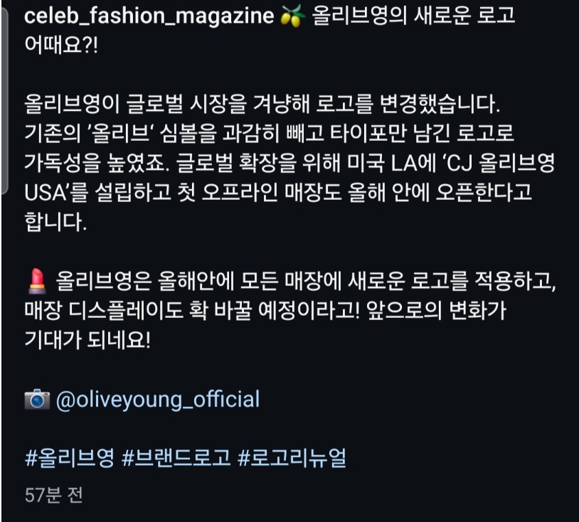 바뀐 올리브영 로고 ㄷㄷ 2월 11, 2025 작성자: KIM 댓글 남기기 응답 취소댓글이름 이메일 웹사이트 다음 번 댓글 작성을 위해 이 브라우저에 이름, 이메일, 그리고 웹사이트를 저장합니다. Δ