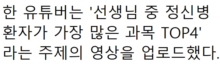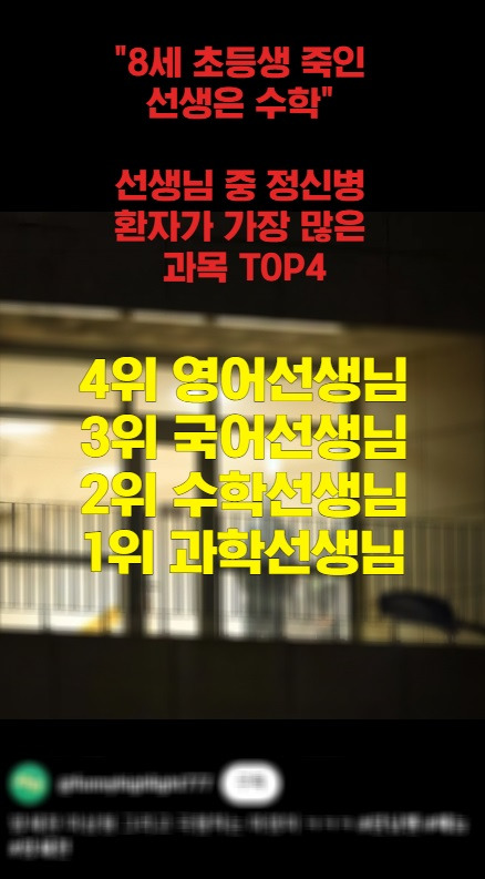 “8세 초등생 죽인 선생은 수학” 선생님 중 정신병 환자가 가장 많은 과목 TOP4 2월 11, 2025 작성자: KIM 댓글 남기기 응답 취소댓글이름 이메일 웹사이트 다음 번 댓글 작성을 위해 이 브라우저에 이름, 이메일, 그리고 웹사이트를 저장합니다. Δ